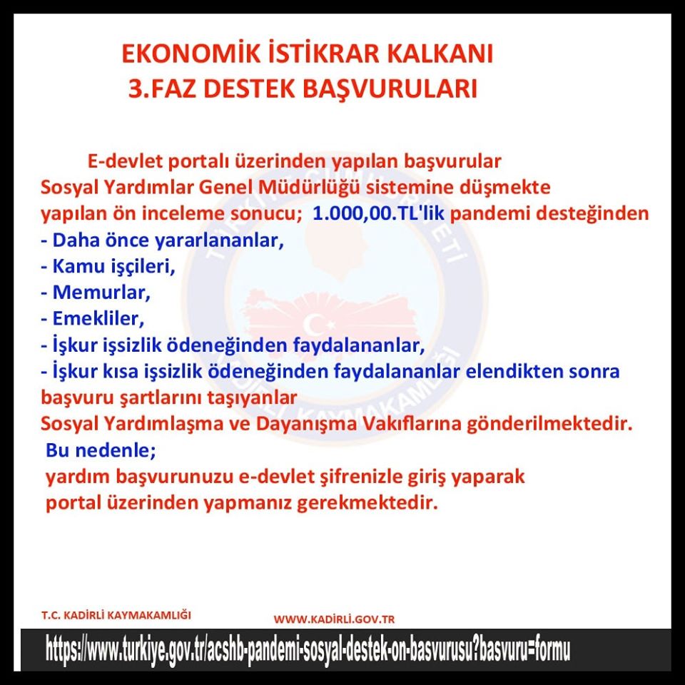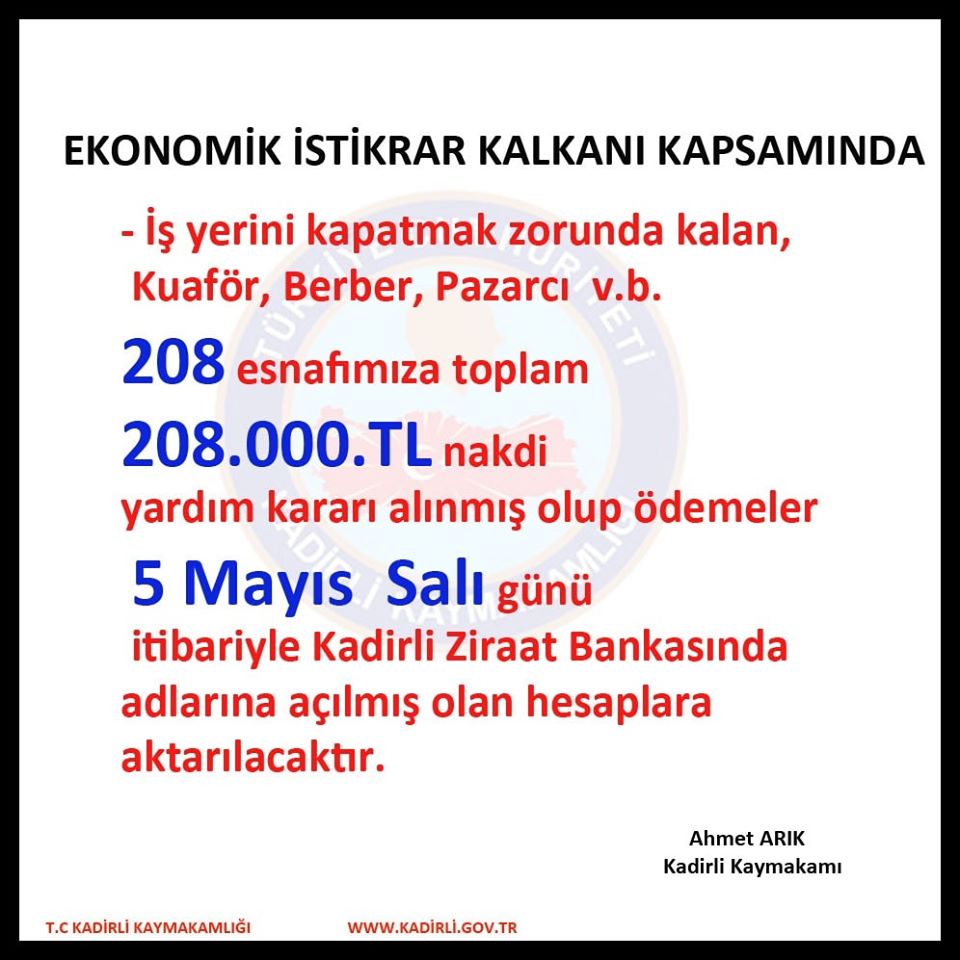 Kadirli Kaymakamlığından yapılan açıklamada “Ekonomik istikrar kalkanı destekleri kapsamında esnafa yapılacak yardımlar kapsamında Kaymakamımız başkanlığında ki mütevelli Heyet toplantısında kuaför, berber ve Pazarcı vb. 208 esnafımıza yardım yapılması kararlaştırımıştır.