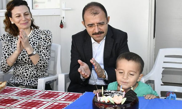 Konteyner Kentte gerçekleşen kutlama, sıcak ve samimi bir atmosferde geçti. Mustafa Arslantaş, Kaymakam Dolu ve eşi tarafından getirilen doğum günü pastası ile mumunu üfleyerek 3. yaşına girdi. Kaymakam Dolu, küçük Mustafa’ya sağlıklı, huzurlu ve başarılı bir yaşam dilediğini belirtti.