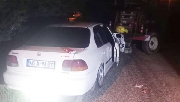 Kaza gece saatlerinde ilçenin Kabaağaç Mahallesi’nde meydana geldi. İddiaya göre A.S’nin kullandığı 46 AHN 811 plakalı otomobil M.D’nin kullandığı 66 ABF 510 plakalı traktör ile kafa kafaya çarpıştı.