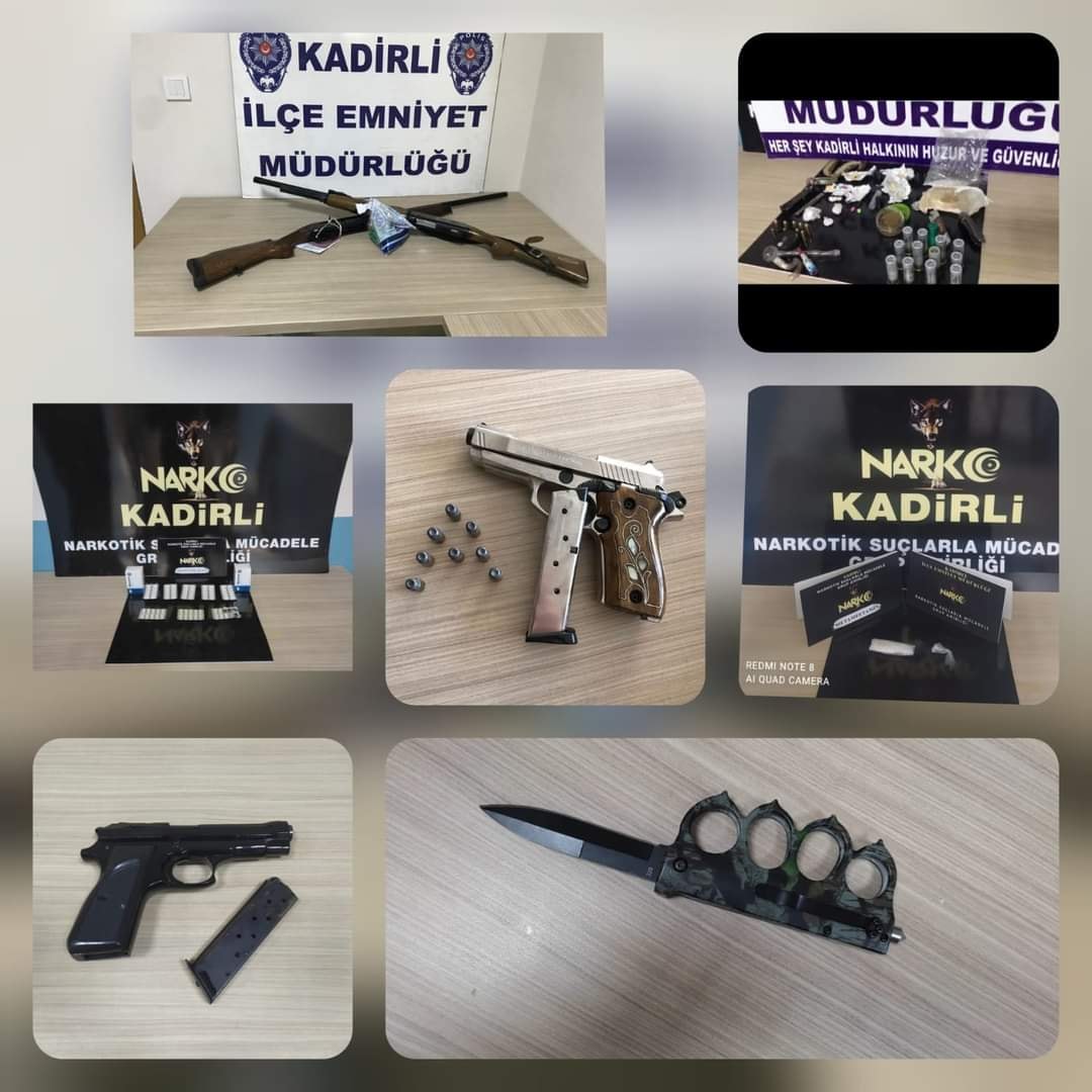 Kadirli İlçe Emniyet Müdürlüğüne bağlı ekipler tarafından yapılan çalışmalarda Uyuşturucu ile mücadele kapsamında 24,63 gr metafetamin, 81,76 gr Sentetik kannobonid, 10,50 Eroin, 4,28 gr kokoin, uyusturucu madde ve 75 adet Nevrotin hap ve 16 adet extacy