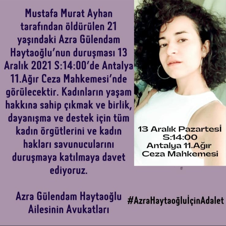 Antalya’da Mustafa Murat Ayhan tarafından öldürülen 21 Yaşındaki Azra Gülendam Haytaoğlu’nun duruşması 13 Aralık’ta Antalya 11. Ağır Ceza Mahkemesinde görülecek.