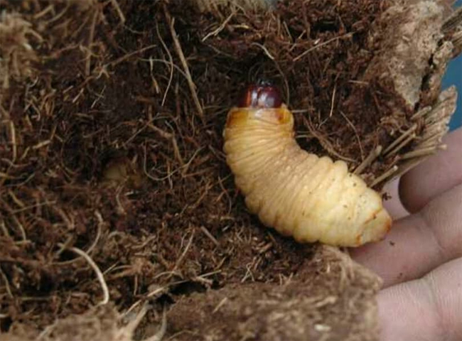 Kırmızı Palmiye Böceği asıl zarara neden olan larva döneminde yaprakların gövde ile birleştiği noktadan gövdede galeriler açarak talaş çıkarmasıyla bilinir. Bu noktalar tespit edildiğinde bir çubuk yardımıyla larvayı galeriden çıkarmak mümkün ise bu zararlı imha edilmelidir.