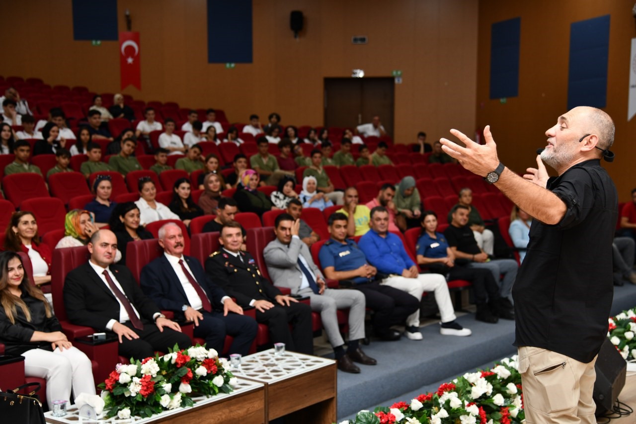 Emniyet Müdürlüğü döneminde ve sanatçı ruhuyla şahit olduğu kıssadan hisselerle yola çıkarak tamamladığı konferansın sonunda katılımcılara önemli mesajlar ileten Ahmet Sula, “Allah’ın lütfettiği devletimin bahşettiği rütbe, makam ve konumlarla ilgili ülkemin ve insanlığın geleceği olan gençlere nasıl faydalı olabilirim diye gece gündüz akıl ve kalp yoran bir kardeşinizim. Biz ve bizim gibilerin siz ve sizin gibi insanlarla buluşması gerekiyor. İşte sevgili öğrenciler yarın bir gün okulları bitirip bazı mesleklere atılacaksınız. Oraya sizleri bugünden hazırlayabilmek adına bizlerden özellikle yöneticilerde üç güzel ahlak olmalıdır. Birincisi feraset olmalıdır. Okuyabilecek görebilecek. İkincisi basiret olacak. Yani fark edebilecek. Bu işi en iyi kim yapar. Üçüncüsü de cesaret. Gereğini yapacak, etkinliği düzenleyeceğiz. Salon hazır, kitle hazır, sen hazır ben hazır, işte bu üç güzellik olmasıydı biz buluşamazdık. Budan dolayı da Osmaniye’de görev yapan yöneticilerimiz sizler de iyi ki varsınız. Alıştığınız emniyet müdürü profilinin dışındayım. Bu coğrafya şu çorak topraklar ve şu çileli vatan bana şunu öğretti. Burada mesele insanın kalbine dokunabilmektir. Gerçekten sevmek ve sevilebilmektir. Roma da bir resim sergim vardı. Bir tane İtalyan geldi. Tepeden tepeden konuşuyormuş gibi anlattı bana. Dedi ki ben Roma’nın en büyük galerisinin 10 yıl direktörlüğünü yaptım, dünya çapında 200 sergi açtım. Epeyce konuştu. Tercümanımız vardı. Tercümana dedim ki soran bakalım anlatacakları bitti mi? Sordu evet bitmiş dedi. Ona söyle dedim. Anlattıklarından daha fazlasını bulacağı bir sanatçı ve sanatıyla tanışacak, bunu kendisine söyle dedim. Tercüman çevirdi. Adam bir resimlere baktı bir bana baktı ve doğru söylüyor dedi. Şuanda bir ego kastım. Bunu neden yaptım sizce? Çünkü toprağıma, vatanıma, milletime, sanatına, felsefesine güvendiğim için yaptım. Ne mesaj vermek istiyorum? Sevgili gençler öyle necip bir toplumun torunlarıyız ki ecdadımız, tarihimiz, vatanımızı fark ettikçe şunu fark edecek ve sizde fark ettirmeye çalışacaksınız” diye konuştu.
