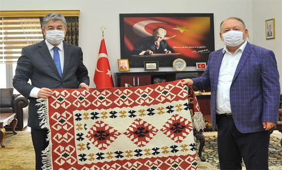 Tarhan, ziyaretin anısına Yılmaz’a dünyaca ünlü Karatepe Kilimi ile birlikte kitap hediye etti..