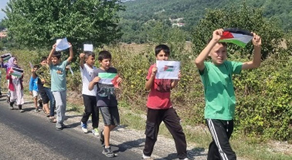 Yaklaşık 50 Kur’an kursu öğrencileri, kendi çizdikleri Filistin bayraklarıyla slogan atarak İsrail’e lanet yağdırdılar.