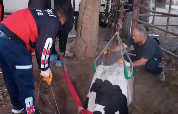 Olay yerine gelen İtfaiye ekipleri 2.5 metrelik çukurda mahsur kalan ineği iş makinesi yardımıyla ineğe halat bağlayarak çıkardı. Yaklaşık 40 dakika süren çalışmanın ardından kurtarılan ineğin sağlık durumunu iyi olduğu belirlendi.Kurtarılan inek, sahibine teslim edildi.