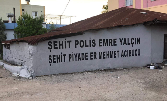 Mahallenin gençleri boyadıkları duvara bu mahallede yetişmiş ve vatan için şehit olmuş Şehit Polis Emre Yalçın ve Şehit Mehmet Acıbucu’nun ismini yazdılar.