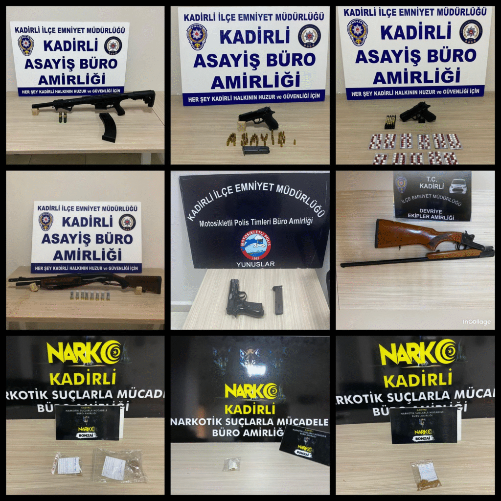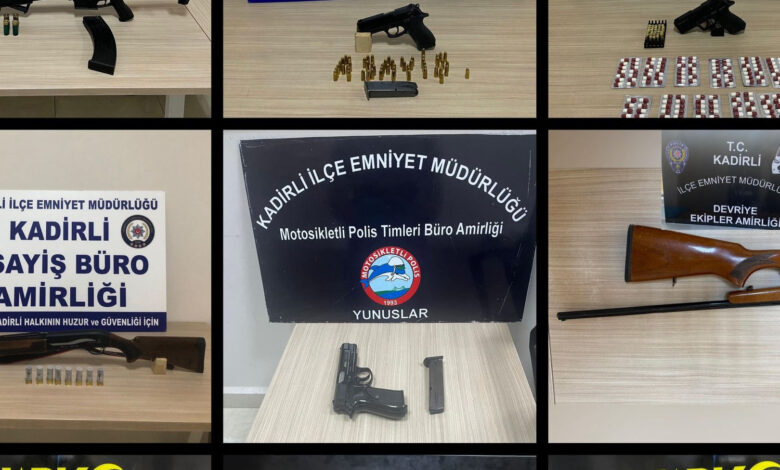 Uygulamalarda, ruhsatsız 2 tabanca ve 3 tüfek ile 1 kurusıkı tabanca, 85 fişek, kesici alet ve bir miktar uyuşturucu ele geçirildi.