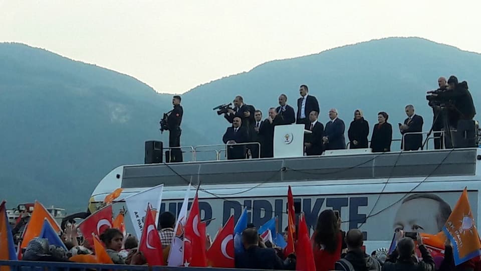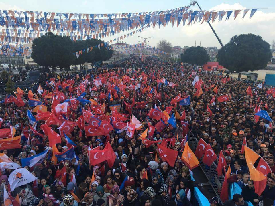 “Operasyonun, komuta kademesinde yaptığımız, yapmakta olduğumuz müzakerelerde, millet gelsin dendiği anda sefer görev emri çıktığı anda önce ben sonra da millet beraber yürüyeceğiz. Birileri gibi gidip de Esed’ten talimat almaya ihtiyacı yok bu milletin. Öyle diyorlar, işte millet ve zafer. Sabah itibariyle etkisiz hale getirilen teröristlerin sayısı 1931’e ulaştı. Ne dedik biz, bu millet zilletten doğmadı, bu milletten illetten doğmadı, bu millet şu kopan fırtına Türk ordusudur yarabbi. Bu yola çıktık. Dün, Mehmet’imizi, Mehmetlerimizi cuma namazını kılarken izlediniz değil mi, bu millet hiçbir yerde teknolojinin önünde eğilmedi, sadece Allah’ın huzurunda, rükuda ve secdede eğildi. Biz buyuz. Gençler şuanda askerimiz JÖH-PÖH tüm komandolarıyla hamdolsun üzerine düşen görevi harfiyen uyguluyor. Artık kendi SİHA’larımızla F-16’larımızla uçuyoruz. Tank ve toplarımızla yürüyoruz. İnlerine girdik. O dağları delmişler, tüneller yapmışlar. Çimentolar nereden gelmiş o dağlara. Hepsini biliyoruz biz, kimin verdiğin ide biliyoruz. Bunları telefon görüşmelerinde kendilerine söyleyeceğim. Bunlara beton mikserleriyle siz gönderdiniz o çimentoları, siz yaptırdınız, bu tünellerle teröristlerin yaşam imkanlarını hazırladınız. Şimdi Türk Milletine yönelmeyin. Ders alacak birileri varsa o sizsiniz. Kim olursa olsun, bizim mücadelemiz teröristlerle. Tek terörist kalıncaya kadar mücadele devam edecek. 911 kilometre Türkiye sınırında biz sessiz duracağız, beyefendiler burada söz sahibi olacak, bu nasıl iş. Bir de bize akıl vermeye kalkacaklar. O aklı kendinize saklayın. Çok ihtiyacınız var. Siz hiçbir zaman adil olmadınız. Siz hiçbir zaman zulmün karşısına dikilmediniz. Ama biz tarih boyunca hep adalet ile hükmettik. Biz Osmanlıydık ama ta 1 kişi için Hint yarımadasındaydık. Bizim böyle bir asaletimiz var. Bunlarda böyle bir şey yok. Kim sivili öldürüyor. Vakti saati geldiğinde birlikte Afrin’e gideceğiz. 15 Temmuz’da size çağrı yaptım meydanlara döküldünüz. Tankların, F-16’ların, topların dikildiniz. Ne oldu o FETÖ’cüler, kaçtılar. Biz kovaladık onlar kaçtı. Şimdi Pelsinvanya’da. Hadi gel. Niye gelmiyorsun. Onun bu ülkeyle alakası, topraklarla, milletle alakası yok. Arkasında kimlerin olduğunu biliyorsunuz. Türkiye Cumhuriyeti’nden başka devletimiz yok. Böldürmedik, böldürtmeyeceğiz. Devletimiz daha da güçlü hale geliyor. İşte ittifakımızı kurduk mu, çalışmalar bitti. Meclise gönderildi. Meclis çalışmalarını yaparak inşallah bu ittifakımızı çok çok güçlü bir şekilde sürdürecek ve Allah’ın izniyle Kasım 2019’da Türkiye’den bu ittifakın en anlamlı sesini dünyaya duyuracağız. Birileri bölmenin peşinde. Boşuna heveslenmesinler. Biz bir, iri, diri, kardeş ve hep birlikte Türkiye olacağız. İnşallah Mart ve Kasım’da en güzel cevabı vereceğiz. Afrin bunun işaret fişeğidir. Afrin’de benim milletim, askerimiz destan yazıyor. İnşallah zaferle sonuçlanacak. Şimdi biz yeni bir müjde bekliyoruz inşallah.”