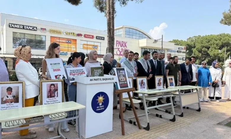 Osmaniye AK Parti Gençlik Kolları Başkanlığı tarafından Gazze’de yaşam hakkı elinden alındığı için okula başlayamayan çocukları anmak amacıyla “boş sıralar” protestosu düzenlendi.