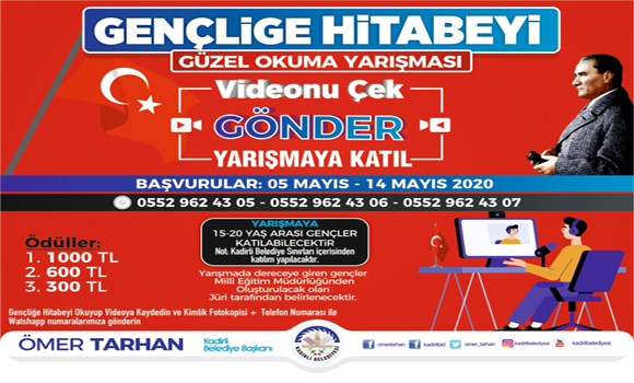 Kadirli İlçe Sınırları içerisinde bulunan 15-20 yaş arası gençlerimiz Gençliğe hitabeyi okuyun videoya alın ve 0552 962 43 05 – 0552 962 43 06 – 0552 962 43 07 watshapp numaralarına ikamet bilgileri, telefon numarası ve kimlik fotokopisini gönderin yarışmaya katılın.