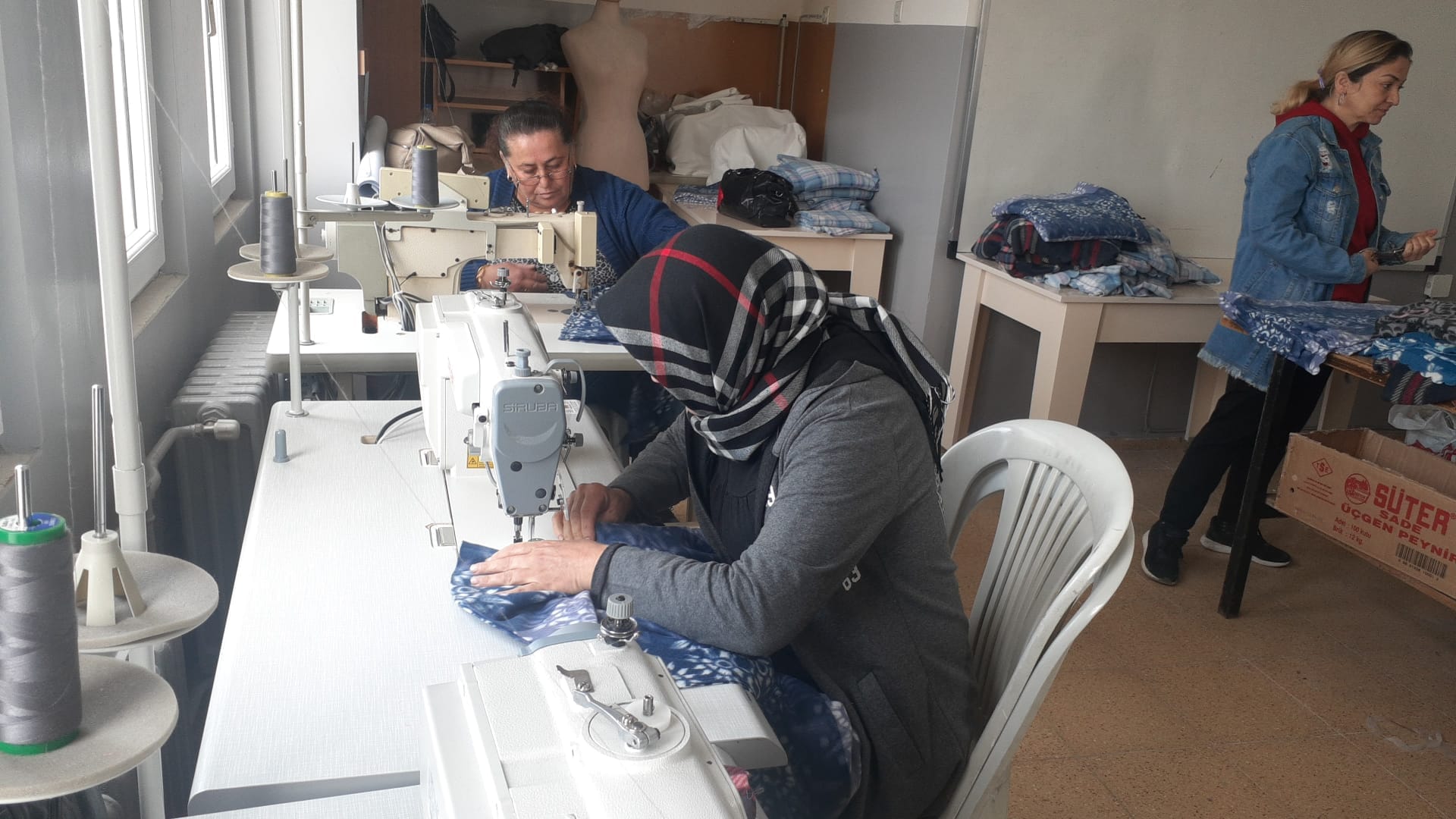 İlçe Milli Eğitim Müdürlüğü koordinesinde, Halk Eğitimi Merkezi öğretmenleri ve usta öğreticileri tarafından yaşanan deprem felaketinden etkilenen illerimizdeki depremzede vatandaşları için pijama, eşofman takımı dikiyor.