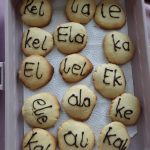 Dönay öğretmen, velilerin katılımlarıyla evde yapılan kurabiyelerin üzerine çikolatalarla sınıfta verdiği seslerle oluşturulan kelimeleri, heceler şeklinde yazıldı.