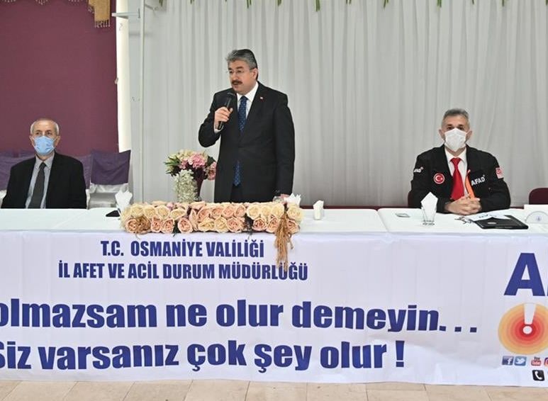 Vali Yılmaz konuşmasının devamında, afet öncesi çalışmaların önemini vurgulayarak, ”Bunların içinde en önemlisi de depreme karşı yapı stokunun güçlendirilmesidir. Bu anlamda sadece Devletimizin değil vatandaşımızın da bu işi sahiplenmesi gerekiyor. Depreme dayanıklı olmayan binaların bir an önce yıkılması gerekiyor. Biz bu çalışmayı başlattık, ilk toplantımızı da Bahçe İlçemizde yaptık. Yıkılması gereken binaların Kaymakamlıklarımız, Belediyelerimiz ve vatandaşımızın işbirliği içerisinde yıkılması ve tespiti yapılamayanların tespitinin bir an önce yapılması gerekiyor. İlimiz ana fay hatlarının üzerinde bu nedenle depreme karşı hazır olmamız gerekiyor. Afetlerin zamanını önceden kestirmek mümkün olmadığı için bir an önce hazır olmak, binalarımızın depreme dayanıklı hale getirmek zorundayız. Bu maliyetli bir iş ama başarmak zorundayız. Bu konuda Devletimizin desteği var. Biz de bu anlamda vatandaşlarımıza destek olacağız.”dedi.