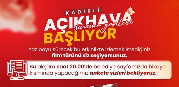 Belediye Başkanı Mustafa Mert Olcar, bugün akşam (8 Temmuz Pazartesi) saat 20.00’da @kadirli_belediyesi sosyal medyada hesabının hikaye kısmında düzenlenecek ankete sinemasever herkesi katılmaya davet ederek, “Mert Belediyecilik anlayışıyla yıldızların altında açık sinema keyfi için gelin hep birlikte izlemek istediğimiz film türünü beraber seçelim. kadirli_belediyesi sayfamızda hikaye kısmında ki anketten seçim yapabilirsiniz. Kadirli’de yaşayan halkımız, yaz ayı boyunca film keyfi yapmanın yanı sıra, aileleri ve arkadaşlarıyla bir araya gelerek keyifli zaman geçirecekler. BUGÜN akşam saat 20.00’daki anketimize katılarak vereceğiniz destek bizleri mutlu edecektir.” dedi.