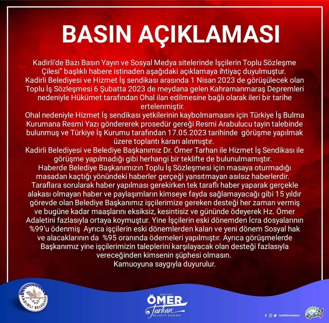 Kadirli Belediyesi ve Belediye Başkanımız Dr. Ömer Tarhan ile Hizmet İş Sendikası ile görüşme yapılmadığı gibi herhangi bir teklifte de bulunulmamıştır.
