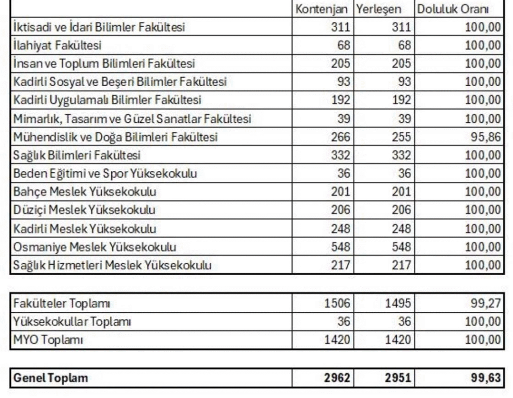 KADİRLİ Meslek Yüksek Okulu müdürü Burak Kocaoğlu yeni kayıtlarla ilgili olarak “OKÜ doluluk oranımız %99,63, Kadirli MYO doluluk oranımız %100 oldu. OKÜ ailesine katılan tüm öğrencilerimize başarılar diliyorum” diye konuştu.