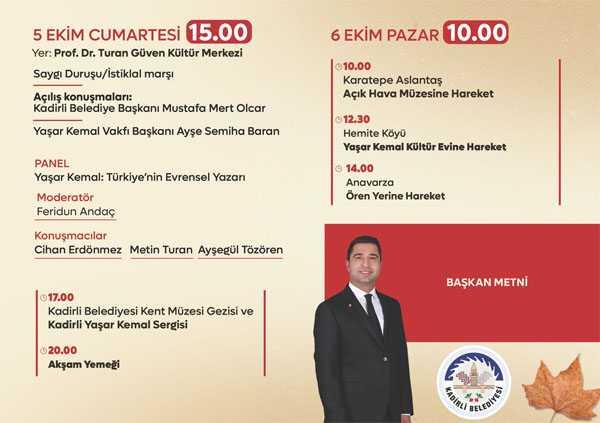 Cumartesi günü saat 15.00’da Prof. Dr. Turan Güven Kültür Merkezi’nde Belediye Başkanı Mustafa Mert Olcar ve Ayşe Semiha Baban’ın (Yaşar Kemal’in Eşi) katılımıyla başlayacak etkinlikler, Kent Müzesi’nin ve serginin gezilmesi ile devam edecek. 6 Ekim Pazar günü ise Karatepe Aslantaş Müzesi, Yaşar Kemal kültür Evi ve Anavarza Ören Yeri gezisi ile sona erecek.