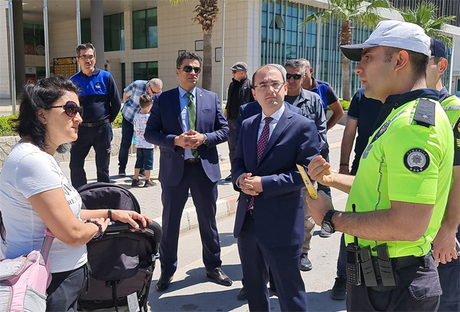 Sürücülere 5 Adımda Güvenli Trafik mottosu hakkında bilgi veren Kaymakam Selimoğlu, Yaya ve okul geçitlerinde dikkatli olmaları, trafik kurallarına riayet edilmesi konularında uyarılarda bulunurken, yayalara da yaya geçidini kullanmaları uyarılarında bulunarak broşür dağıttı.