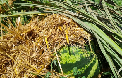 Meyvede güneş yanığı olmaması için çabalayan çiftçiler, karpuzların üzerine gazete ve saman örterek aşırı sıcaktan korumaya çalışıyor.