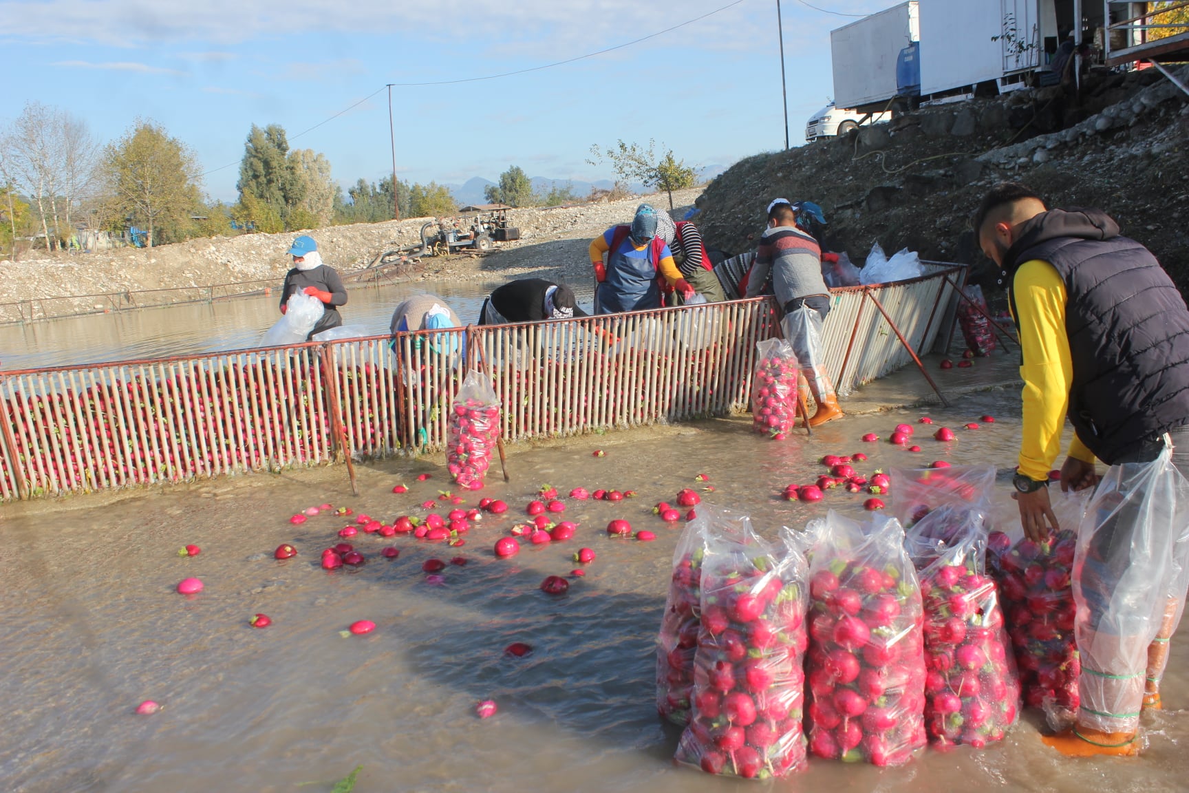 Sezonunda 5 bin kişiye istihdam sağlayan Turp’un sofralara yolculuğu buz gibi suda çalışan işçiler sayesinde oluyor. Sabahın erken saatlerinde işe başlayan işçilerimiz önce buz gibi suda turpları çamurundan ayrıştırıyor ve yine buz gibi suda seçerek paketliyorlar.