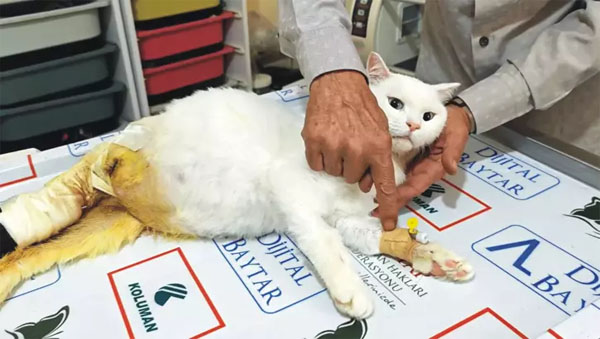 Veteriner Hekim Ali Laçinbala ise “Halil amcamız akşam saatlerinde bizleri aradı ve kedinin fotoğrafları ile bilgilerini bizlerle paylaştı. 400 kilometre uzaklıkta bulunan kediyi sırf şifa olabiliriz maksadıyla bize getirdi. Yapmış olduğumuz ilk muayenede karın bölgesinde çok ciddi bir şişkinlik fark ettik. Mesaneye sonda bağladık ve boşalttık. Lavman yaparak bağırsakları boşaltmaya çalıştık ancak karındaki şişlik bir türlü inmeyince karın boşluğunda küçük bir operasyonla içeriği tespit etmeye çalıştık. Karın içi, kedinin 4 gündür beslendiği fakat boşaltamadığı sıvı ile kaplıydı. Yoğun bakımda müşahede altına aldığımız kedimizin kırık bölgesinde de çok ciddi bir açık yara ve enfeksiyon tespit edildi. Elimizden gelen bütün destek ile bu cana şifa olmaya çalışıyoruz” diye konuştu. (DHA)