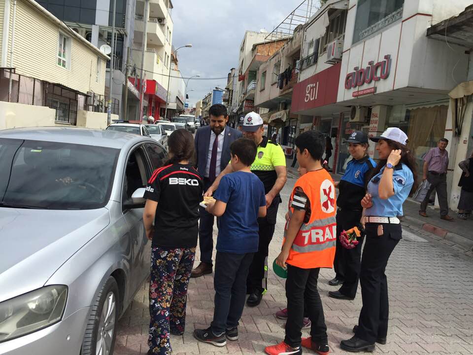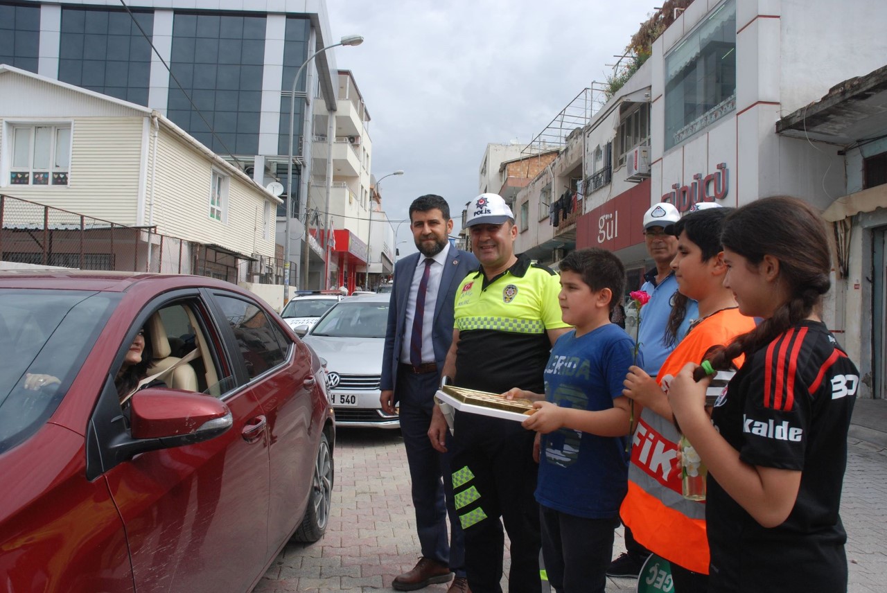 Polis yeleği ve şapkası giyen öğrenciler, Turgut Özal Bulvarı’nda durdurdukları araçların sürücülerinden kurallara uymalarını isteyerek, karanfil hediye edip kolonya ve çikolata ikram etti. Polis memuru Soner Yağbasan da öğrencilere uygulama hakkında bilgi verdi.