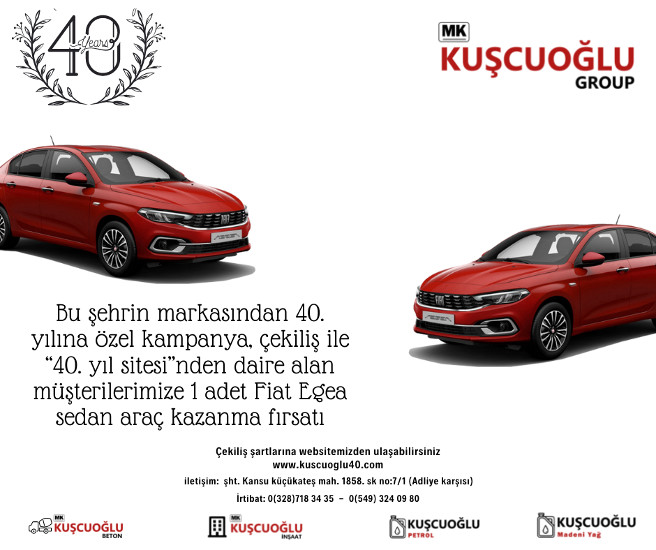 Beton, İnşaat, Madeni Yağ ve Petrol sektöründe birçok kişiye ekmek kapısı olan Kuşcuoģlu, 40.yılında bir kişiyi otomobil sahibi yapacak diyen Kuşçuoğlu Ltd. Şti. Yönetim Kurulu Başkanı Volkan Kuşçu ” Şehit Kansu Küçükateş mahallesinde yaptığımız ve satışa sunduğumuz 47 dairemizden satın alan bir müşterimizi çekilişle sıfır kilometre Fiat Egea otomobil sahibi yapacağız. Çekilişimiz Milli Piyango İdaresi tarafından noter huzurunda yapılacaktır. Ayrıntılı bilgi ve konut projelerimiz hakkında bilgi almak isteyen vatandaşlarımızı Adliye Karşısındaki Kuşçuoğlu ofisimize kahve içmeye bekliyoruz. 40. Yılımızı güzel bir hediye ile taçlandıracak olmanın mutluluğunu yaşıyoruz” dedi.