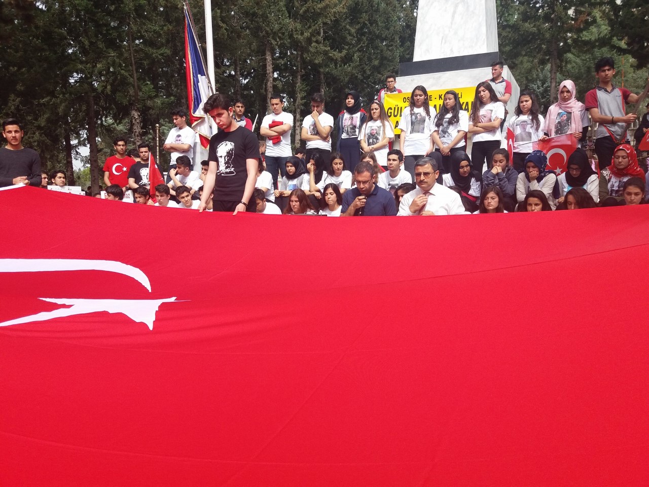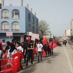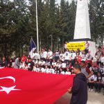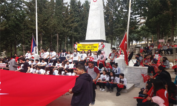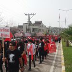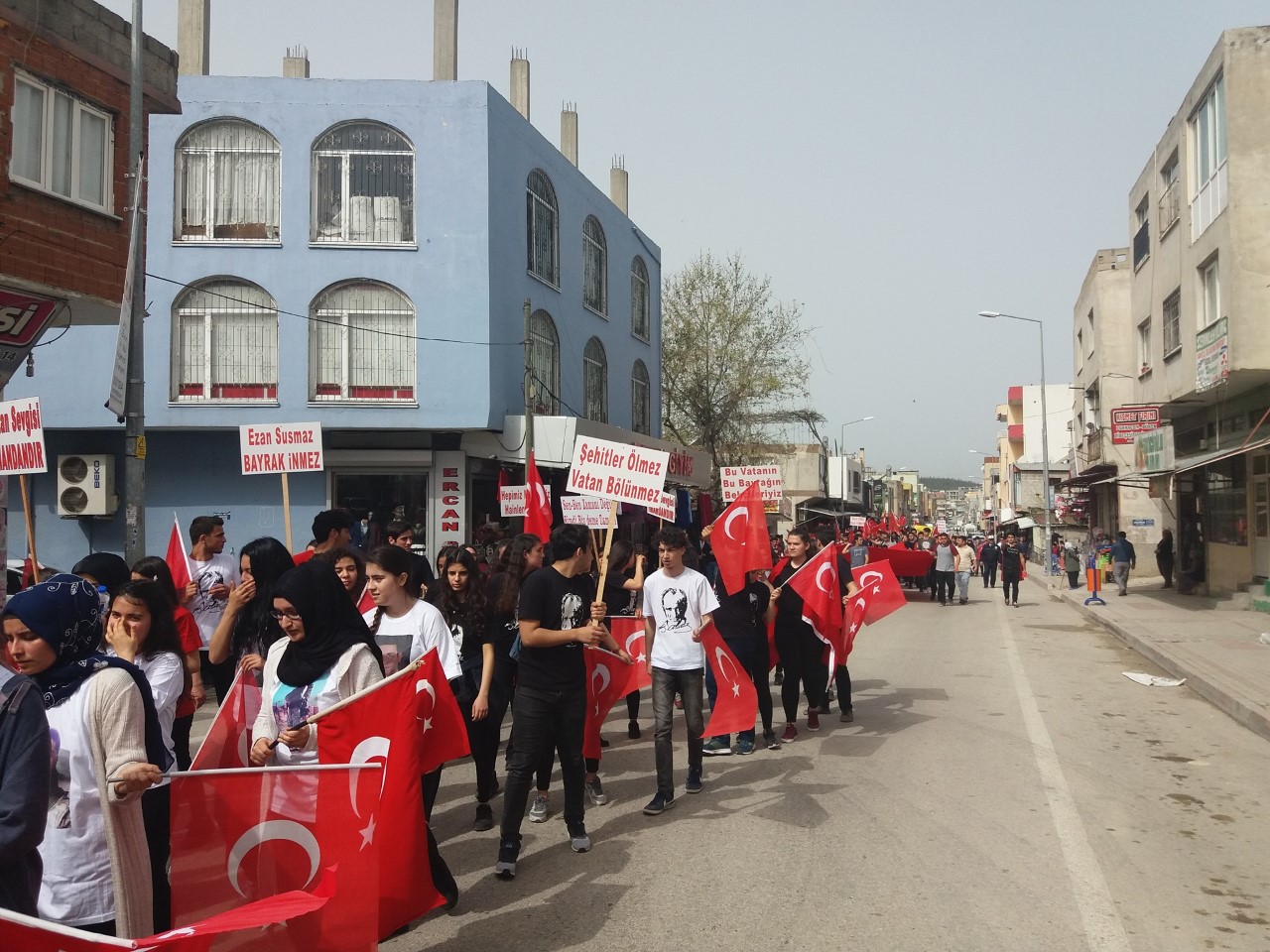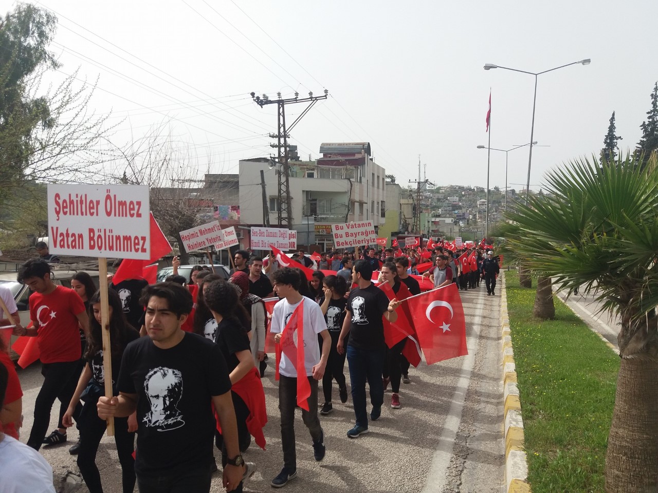 Okullar bölgesinde, ellerinde Türk bayrakları ve “şehitler ölmez, vatan bölünmez”, “Vatan sana canım feda”, “Bu vatan ve bayrağın bekçileriyiz”, “Vatan sevgisi imandandır”, “Hepimiz Mehmetiz, hainlere yeteriz” ve “Ezan susmaz, bayrak inmez” gibi yazılar bulunan dövizlerle şehitliğe kadar “Afrin Şehitlerine Saygı” yürüyüşü yaptılar. Sloganlar atan öğrencilere, vatandaşların alkışlayarak destek verdikleri görüldü.