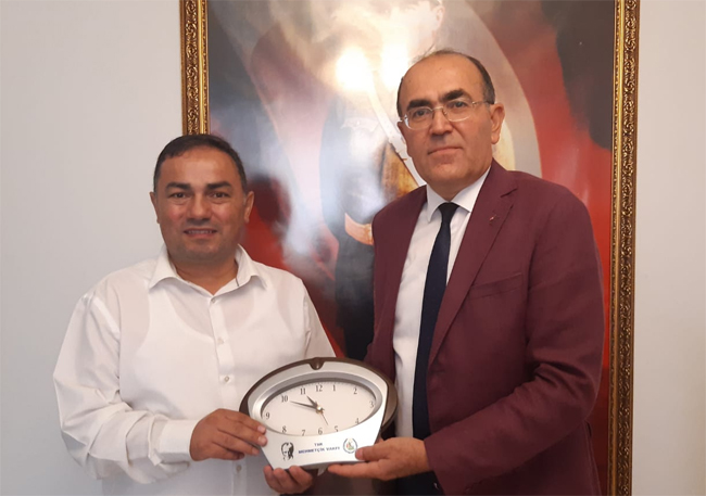 Emekli Albay Hüseyin Akış, Çetin Oranlı’ya ziyaretin anısına hediye takdiminde bulundu.