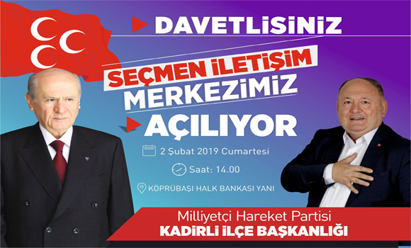 Kadirli Milliyetçi Hareket Partisi İlçe Başkanlığından yapılan açıklamada Seçmen İletişim Merkezinin bugün açılacağı bildirildi. MHP İlçe Başkanı Mehmet Akif Ortak, partimizin 31 Martta yapılacak olan Mahalli İdareler seçimlerinin çalışmalarını yürüteceğimiz Seçmen İletişim Merkezinin açılışının yapılacağını söyledi. Ortak, Köprübaşı Halk Bankası yanında hizmet verecek olan Seçmen İletişim Merkezimizin Bugün saat 14’de MHP MYK üyesi ve Adana Milletvekilimiz Muharrem Varlı’nın da katılacağı açılışımıza tüm hemşehrilerimiz davetlidir dedi. MHP Kadirli Belediye Başkan Adayı ve Belediye Başkanı Ömer Tarhan, Seçim büromuzun açılışına vatandaşları davet ederek şunları kaydetti; “MYK üyesi ve Adana Milletvekilimiz Muharrem Varlı’nın da katılacağı SİM açılışımız bugün Saat 14’de yapılacaktır. Açılışımıza tüm hemşehrilerimizi bekliyoruz. Yeniden tarih yazmak için hep birlikte seçim büromuzu açacağız” dedi.