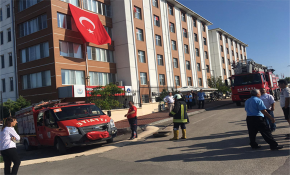 Üst katlarda mahsur kalan öğrenciler, itfaiye ekiplerinin uzattığı yangın merdiveniyle kurtarıldı.