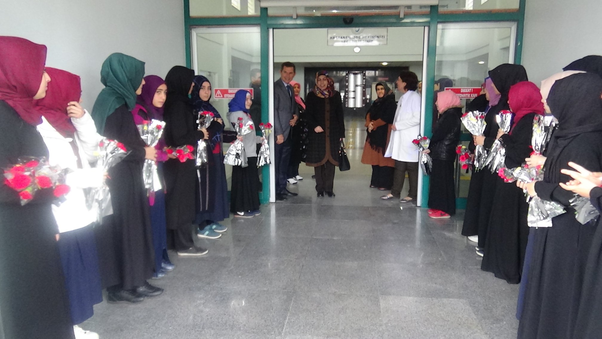 Öğrenciler ve idareciler Devlet Hastanesinde yatan hastaları ziyaret ederek geçmiş olsun dileklerinde bulunarak gül takdim etti.Öğrenciler önce Hastane Başhekimi Op.Dr. İlker HALVACI’yı makamında ziyaret ederek bir süre sohbet ettiler.