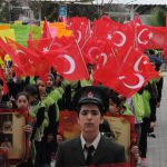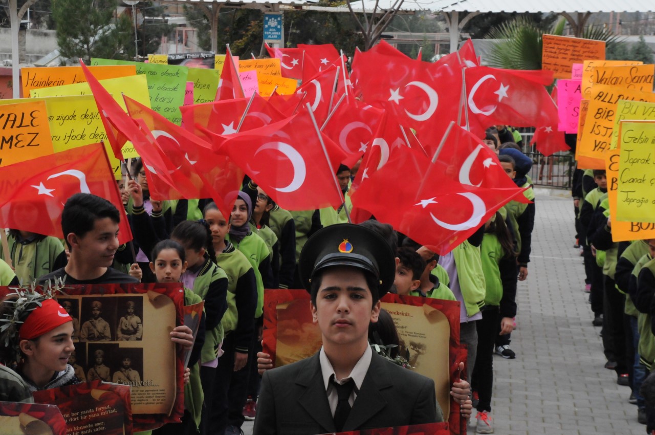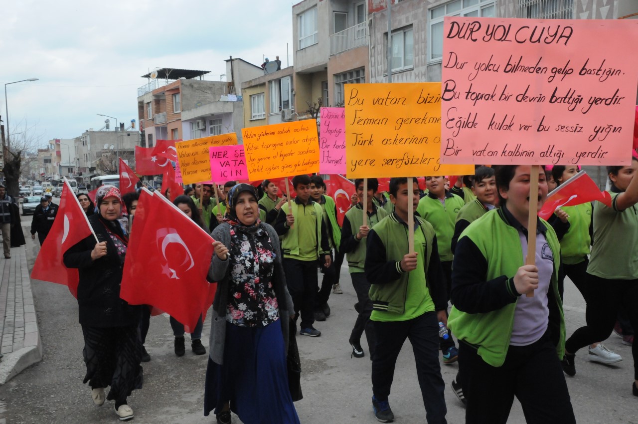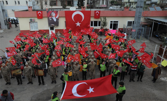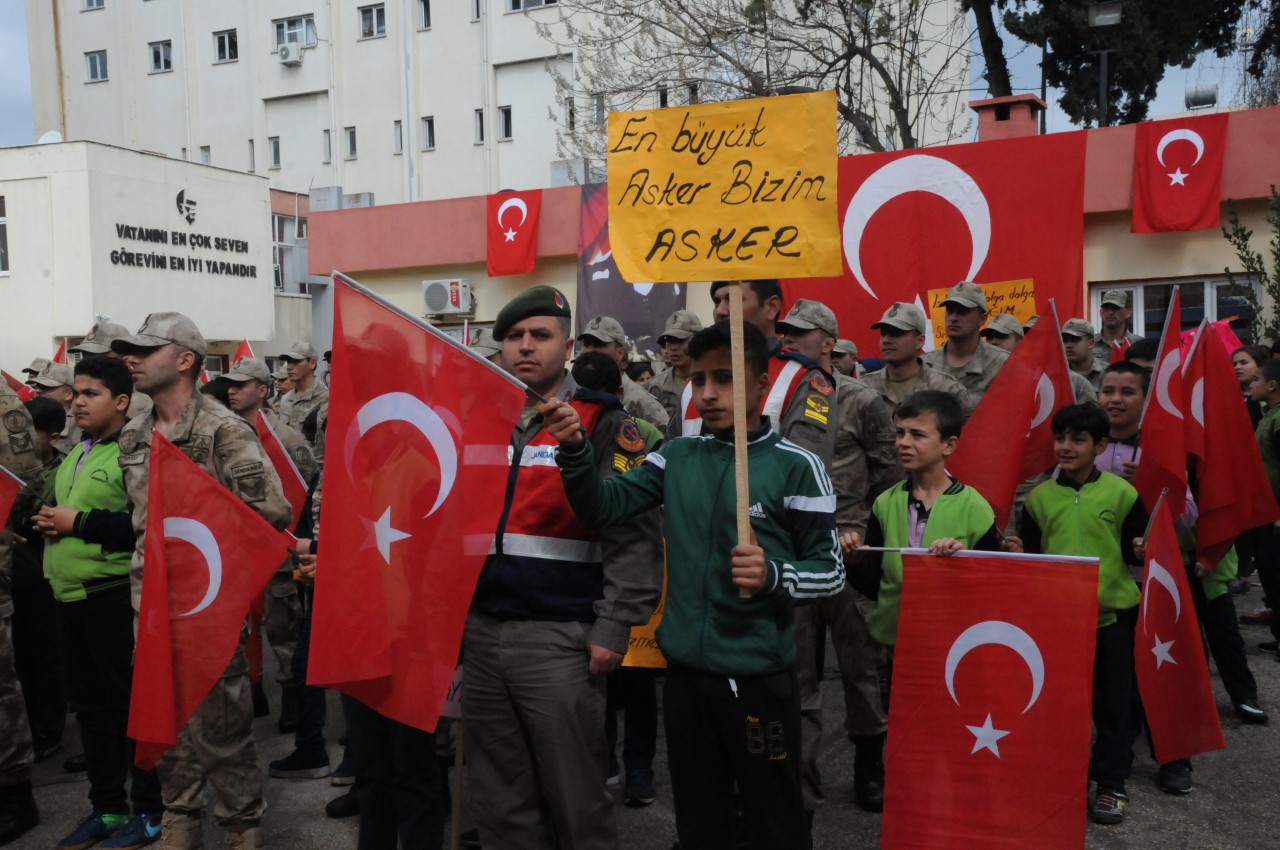 Burada şehitler için Kur’an okundu, dua edildi. Bazı öğrencilerin gözyaşı döktüğü görüldü. Etkinliğe katılan şehit annesi Hürü Zorlu’nun elini öptüler. Öğrenciler, tekbirler ve sloganlar atarak İlçe jandarma bölük komutanlığına gittiler. Şiir okuduktan sonra üzerine özlü sözler yazarak zeytin dalı ile süsledikleri kalp şeklindeki hediyeleri askerlere verdiler. Hep birilikte komando andını okudular.