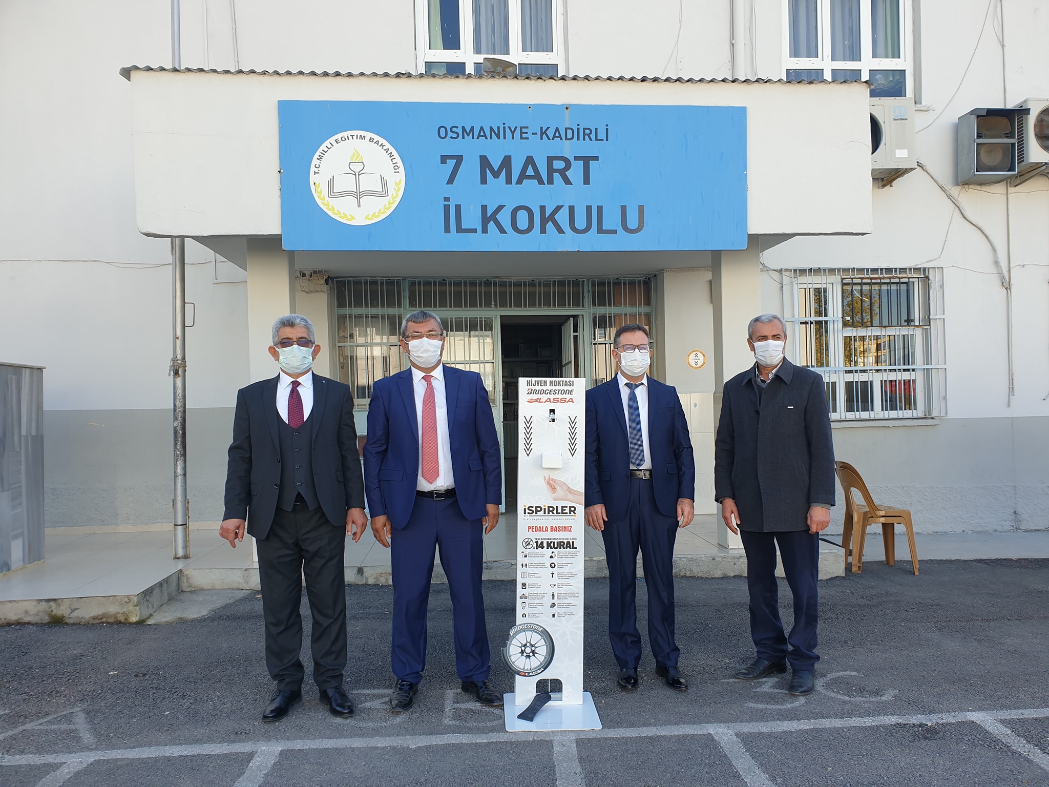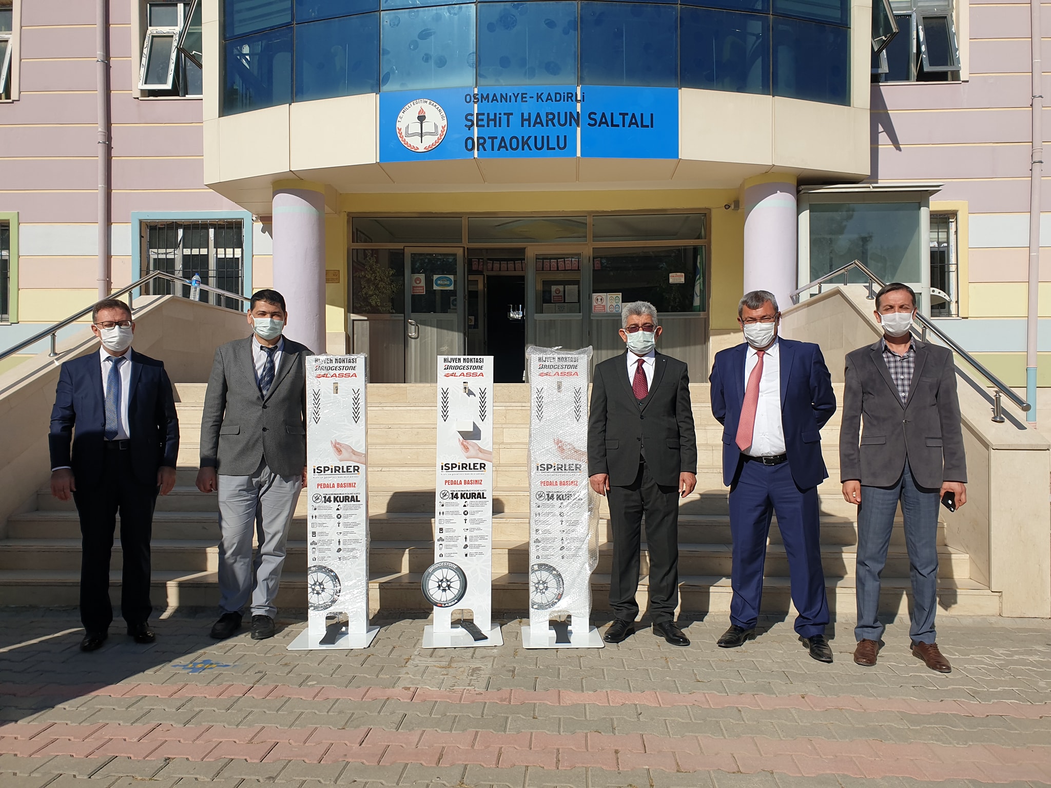 Kadirli Kaymakamı Ahmet Arık, Belediye Başkanı Vekili Engin Karabulut, İlçe Milli Eğitim Müdürü İlyas Tapsız, Ticaret Odası Başkanı Mehmethan Yüksel, Eğitim Bir Sen Başkanı Mustafa Demirci, İlçe Milli Eğitim Şube müdürleri, okul müdürleri ve İspirler Otomotiv yetkililerinin katılımıyla Şehit İsmail Akduman Kız Anadolu Lisesi bahçesinde düzenlenen programla okullara ayaklı el dezenfektan standı ve dezenfektan aparatı dağıtımı başlatıldı.