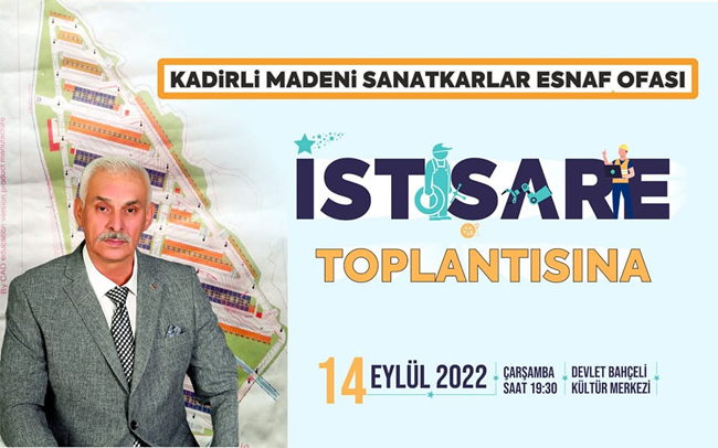 14 Eylül 2022 Çarşamba günü saat 19:30’da Kadirli Belediyesi Devlet Bahçeli Kültür Merkezinde düzenlenecek olan İstişare toplantısına Osmaniye Milletvekili Mücahit Durmuşoğlu, Kadirli Kaymakamı Vehbi Bakır, Belediye Başkanı Ömer Tarhan, Osmaniye Özel İdare Genel Sekreteri Mesut Ovalı, Çevre Şehircilik ve İklim Değişikliği İl Müdürü İrfan Remzi Yılmaz, ile birlikte Sanayi esnafları katılacak.