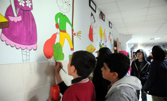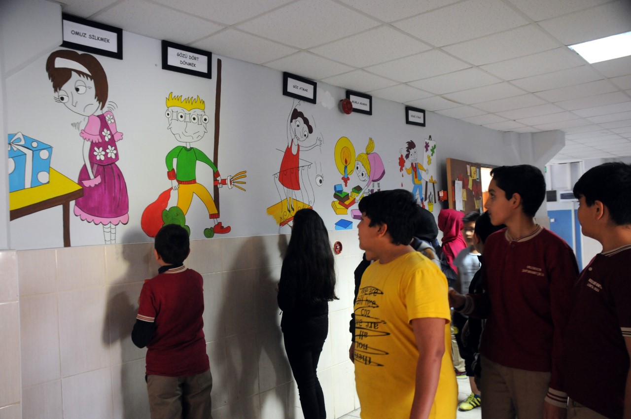 Kadirli Ergenekon Şehit Mehmetçik İlkokulu ve Ortaokulu’nda 10 öğrenci, 2 yıl süren çalışmayla günlük yaşamda kullanılan deyimlere uygun karikatürleri okulun koridorlarına işledi.