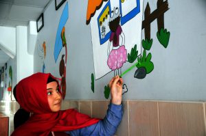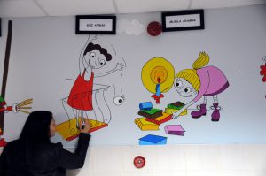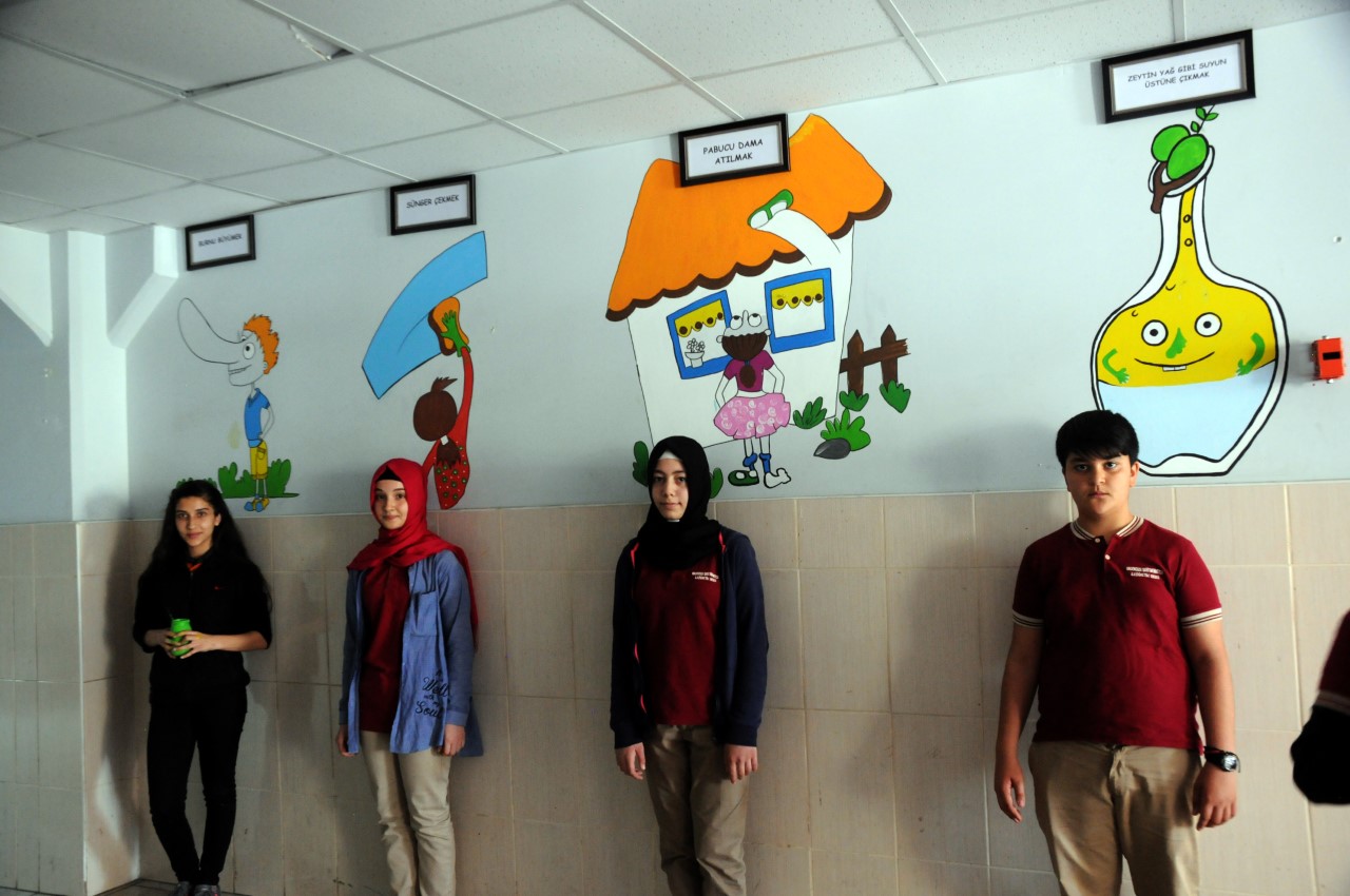 Görsel Sanatlar öğretmeni Mesude Işıklı, ilkokul ve ortaokul öğrencilerine yönelik Türkçe derslerinde görülen deyimleri resim olarak okul koridorlarına çizerek öğrencilerin hafızalarında kalıcı olmasını hedeflediklerini söyledi.