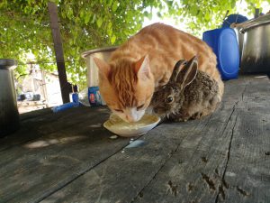 Sumbas ilçesinde, bir kişinin tarlada bulup evine götürdüğü tavşan yavrusuna bir aylık gebe kedi “Sarıkız” sahip çıktı.