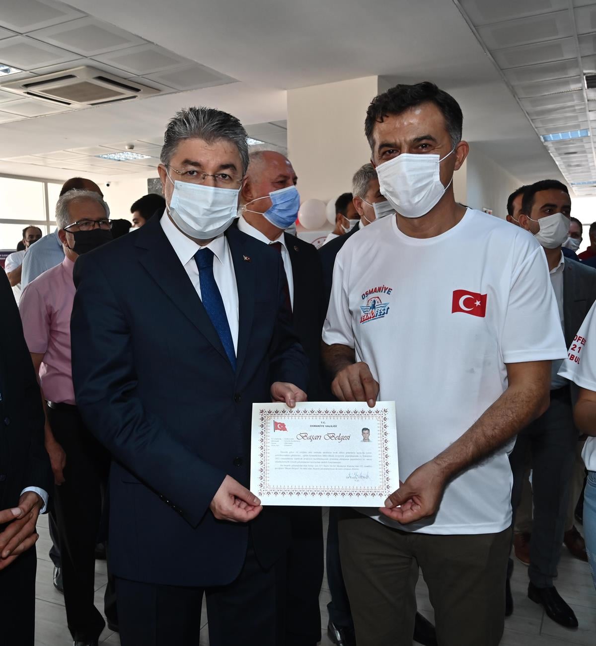 Programın devamında başarı belgeleri takdim edildi. Teknofest İl Sorumluları Sedat Gündoğan, Hüseyin Selami Kaya ve Öznur Gökşen Dinç ile Danışman öğretmenler Saimbey Ortaokulundan Aykut Şimşek ve İbrahim Karayiğit, Şehit Veli Demiryürek Bilim Sanat Merkezinden Dilek Ak, Sıdıka Kök ve Cuma Ali Kılıç, Yedi Ocak İlkokulundan Olga Sarıtekin ve Hasan Aktaş, Mehmet Eminler İmam Hatip Ortaokulundan Abdulkadir Doğdu ve Bülent Kurt, TOBB Osmaniye Fen Lisesinden Hasan İşbilir ve Zekiye Urul, Adnan Oğuz Anadolu Lisesinden Bülent Ünal ve Ali Koçer, Ahmet Cevdet Paşa Anadolu Lisesinden Bilge Gündoğan ve Abdurrahim Alpertunga, Mamure Ortaokulundan Ayhan Erkıran ve Kemal Usta, Mithat Paşa İlkokulu Fatma Asker ve Ahmet Sarıtekin, Şehit Binbaşı Adil Karagöz Anadolu Lisesinden Yusuf Boz ve Aylin Loş Başlamışlı, Mimar Sinan İlkokulundan Uğurcan Kaya ve Tezcan Canik, Toprakkale Mehmet Cevlani Önal İlkokulundan Osman Soylu’ya başarı belgeleri Vali Dr. Erdinç Yılmaz, Osmaniye Milletvekili Mücahit Durmuşoğlu ve protokol mensupları tarafından verildi.