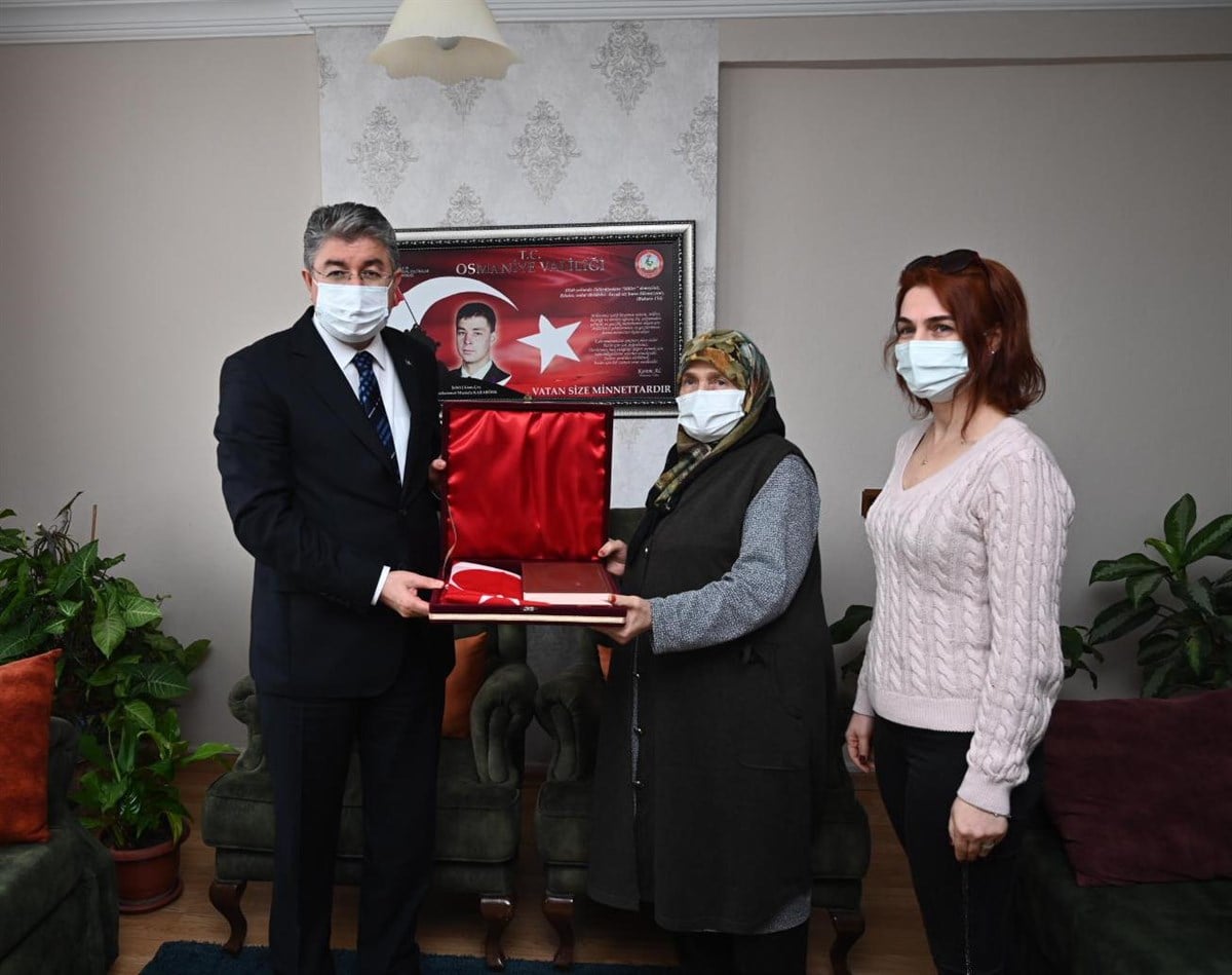 Şehidimizin ailesi, Vali Dr. Erdinç Yılmaz’a ziyareti için teşekkür etti. Ziyaret sonunda Vali Yılmaz, Şehidimizin ailesine Kur’an-ı Kerim ve Türk Bayrağı takdim etti.